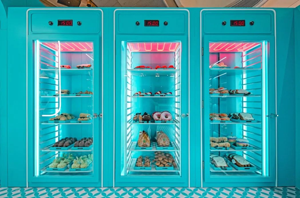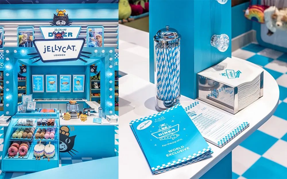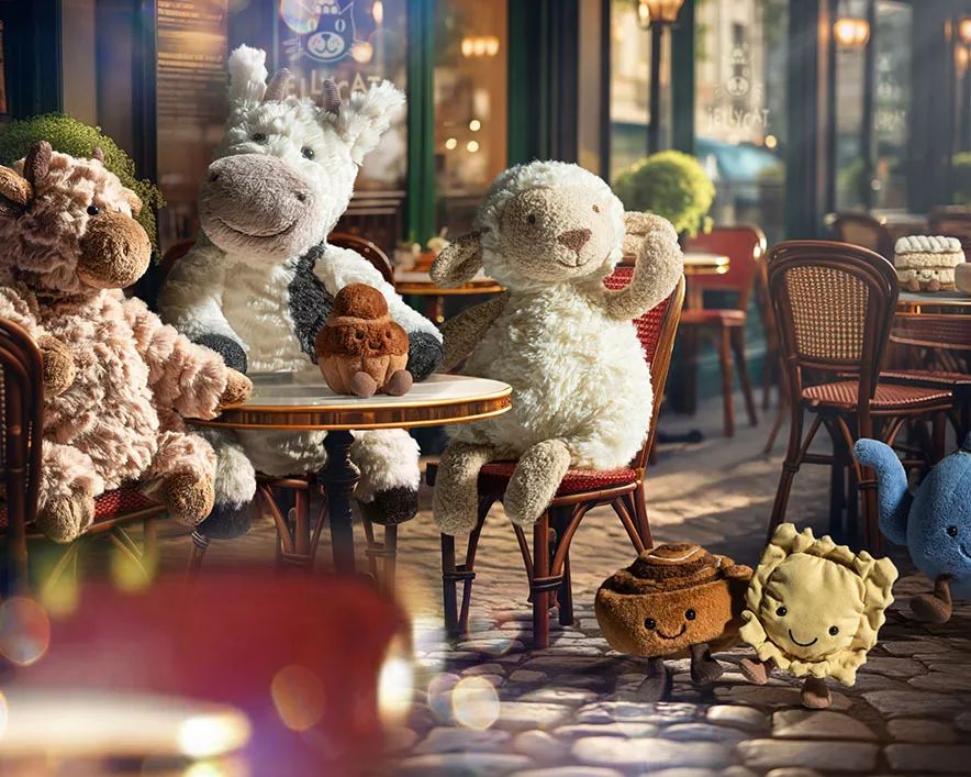伦敦、巴黎门店设计为复古餐厅或面包房,中国上海则是以“Jellycat CAFÉ”为概念,复刻咖啡店场景。设置“烘焙架”“烤箱”等道具,店员会穿着咖啡店员的围裙,化身“咖啡师”。