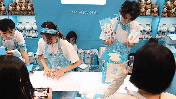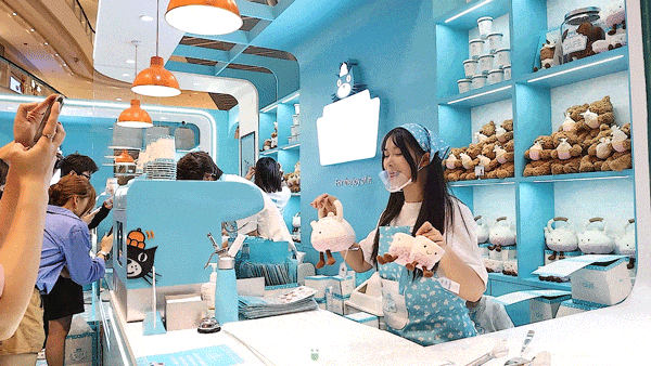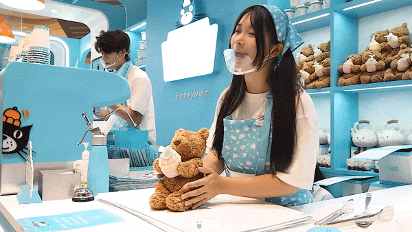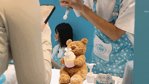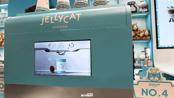 当你在Jellycat门店选定玩偶后,店员会“无实物”地模仿挤奶油、撒糖霜的动作,用空气喷枪制造 “奶油” 效果,甚至最后还会提醒你一句:小心烫手!